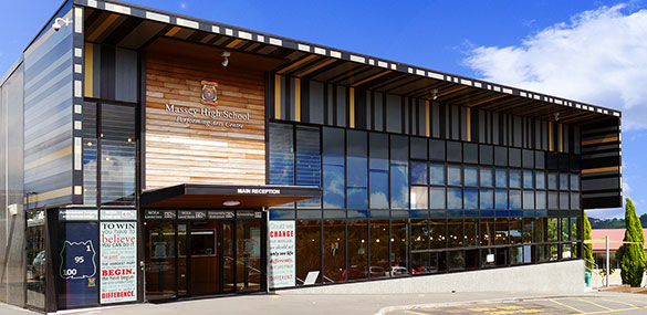 This standout building was designed by Vincent Kumar of Jasmax architects. Massey High School’s Performing Arts Centre is a visual representation of the students’ diversity and school pride. What better way to reinforce this pride, than by using the school colours as a key element in the building’s design?