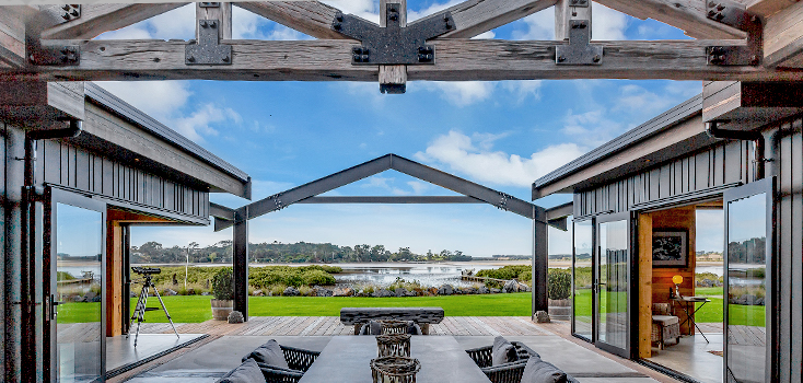 This stunning home pays homage to the classic New Zealand boatshed with its simple shape of four linked pavilions. The home is constructed on the edge of the Mangawhai estuary, the perfect setting to reflect the boatshed theme. Closer inspection reveals a complex and detailed structure, with accents of upcycled historical building materials from historic sites around the country.